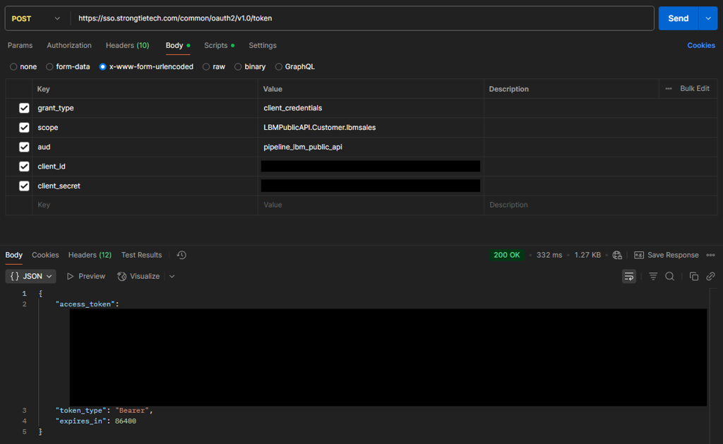 The Public API uses an OAuth2 Endpoint located at: https://sso.strongtietech.com/common/oauth2/v1.0/token Authentication requires a client_id, client_secret, and the Pipeline LBM tenant name. The tenant name is in the Pipeline LBM URL, for example, within https://lb.pipelinebt.app/lbmsales , lbmsales is the tenant name. The tenant name is used to request a scoped JWT token to the LBM tenant and is in the format of: LBMPublicAPI.Customer.<tenant name>